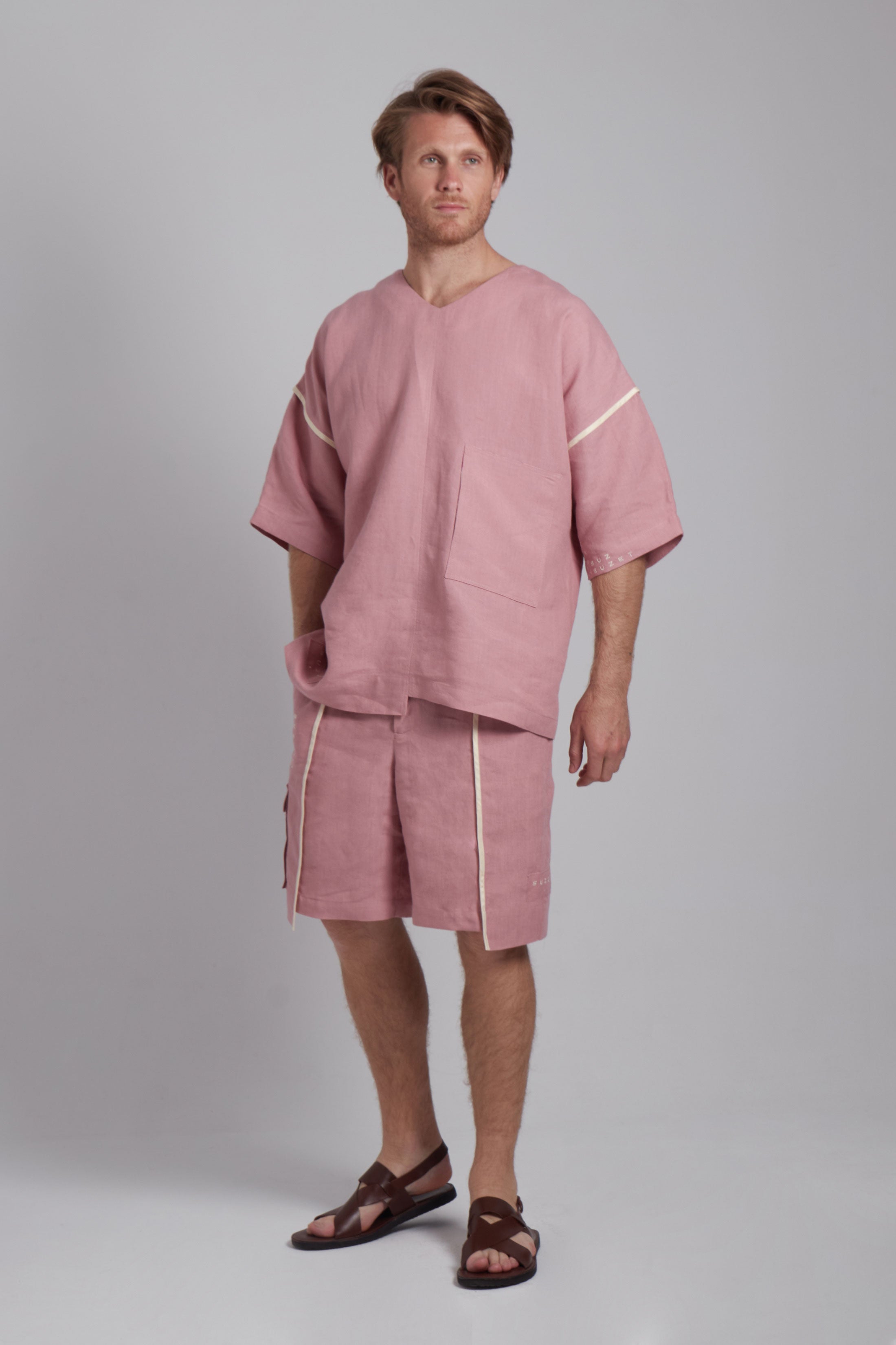 An oversized confortable tee-shirt with refined detailing, asymetrical, in light pink linen