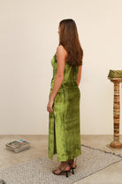 Maxi party dress with a wide décolleté and horizontal and vertical lines structuring the volume. The fabric is a creamy Italian velvet in silk and viscose.