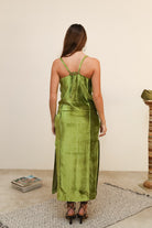 Maxi evening dress with a stunning décolleté, sexy side splits and a playful belt