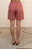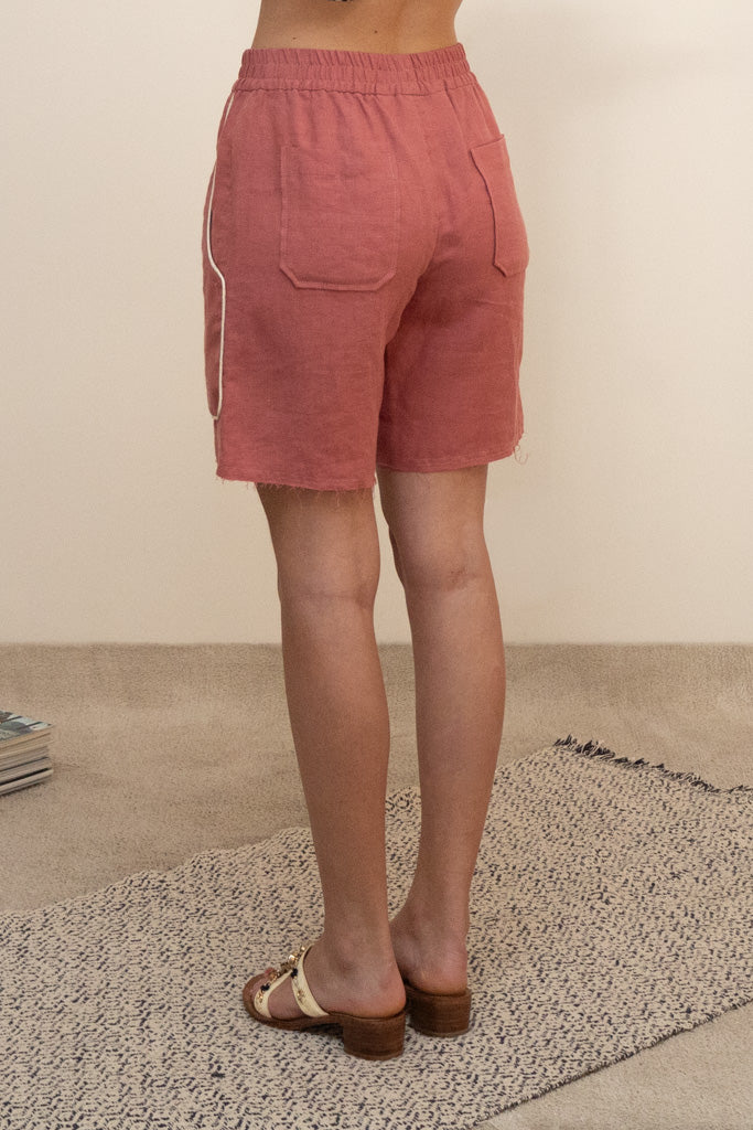 Relaxed yet tailored shorts with two maxi front pockets. The elastic waist allows to wear them at the desired height. In a berry pink linen.