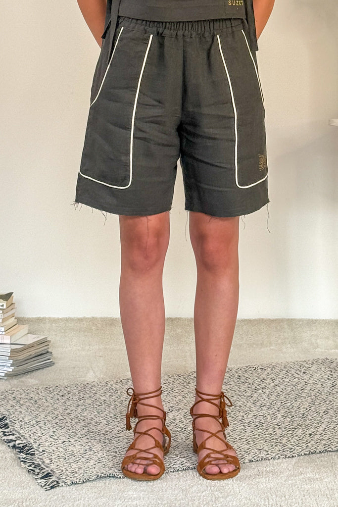 Relaxed shorts in linen with elastic waist, oversized piped front pockets and embroideries