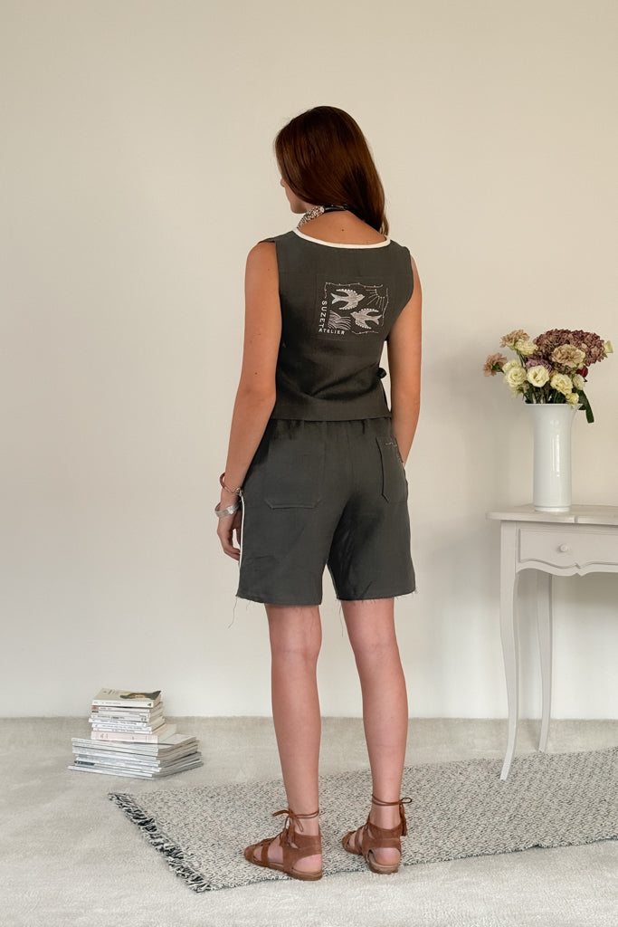 Relaxed yet tailored shorts with two maxi front pockets. The elastic waist allows to wear them at the desired height. In an arabica linen: hues of brown, grey and green.