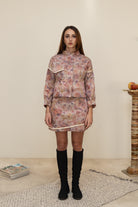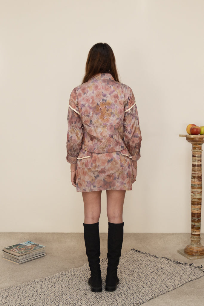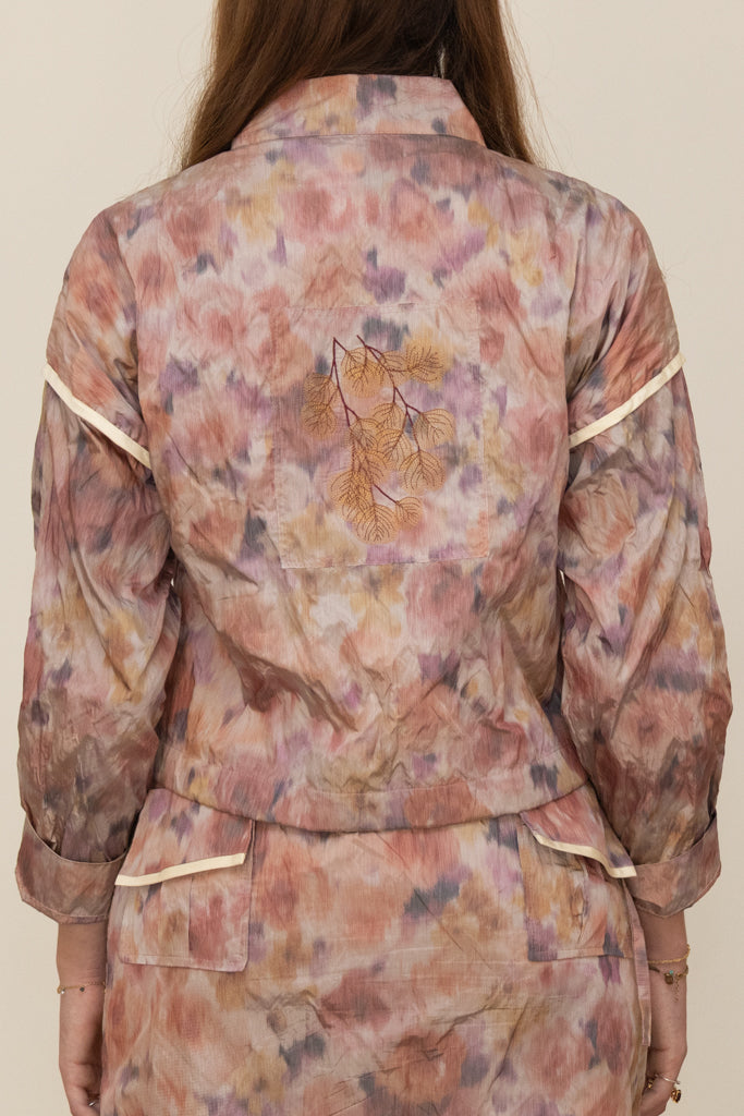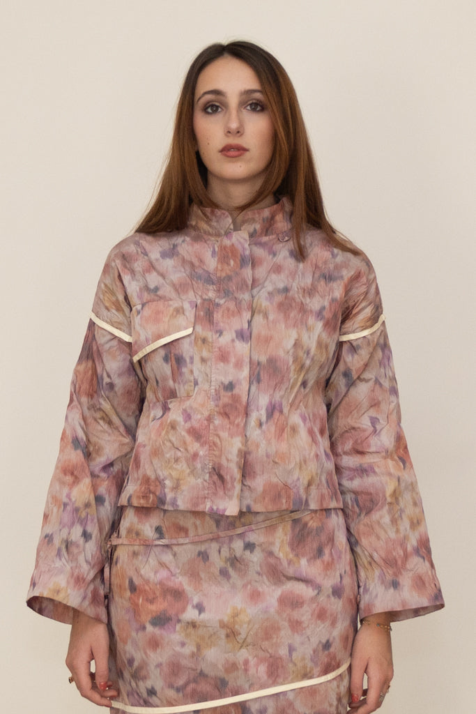 Oversized short jacket with apparent front piping, a tailored and sexy cut. In a joyful printed polyamide taffeta.