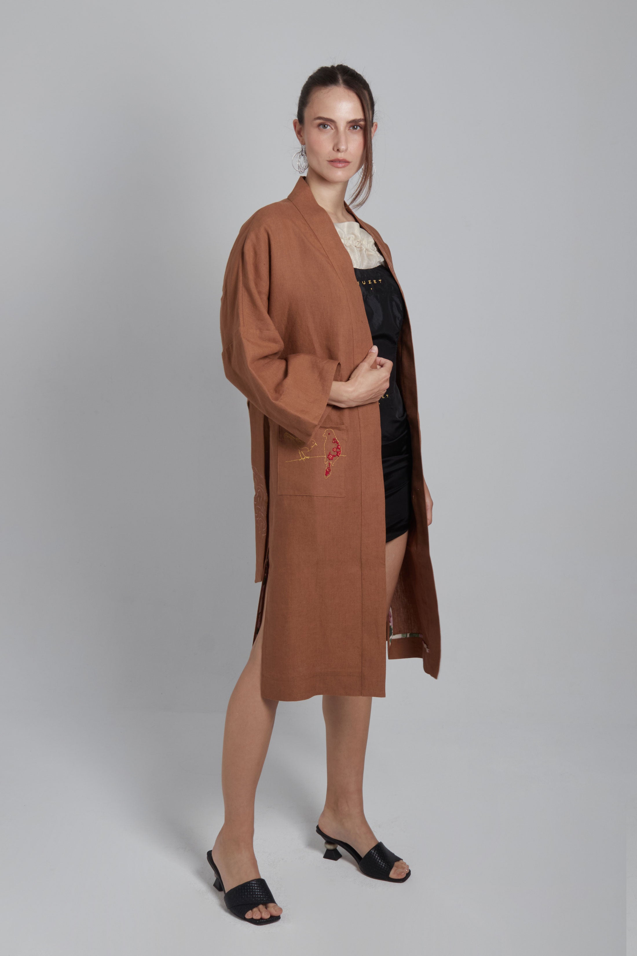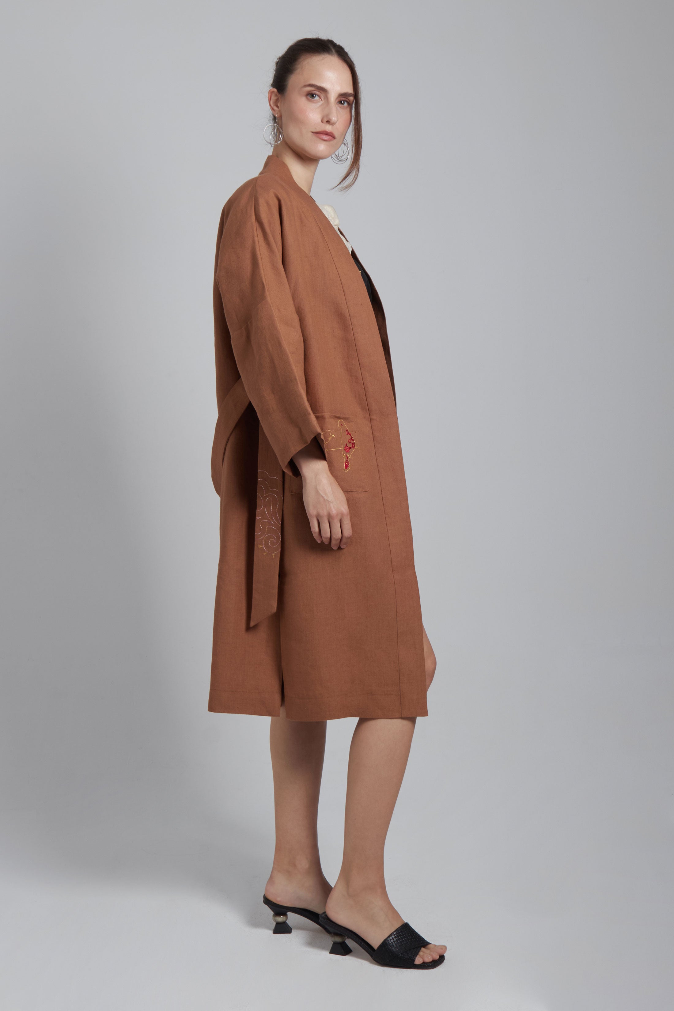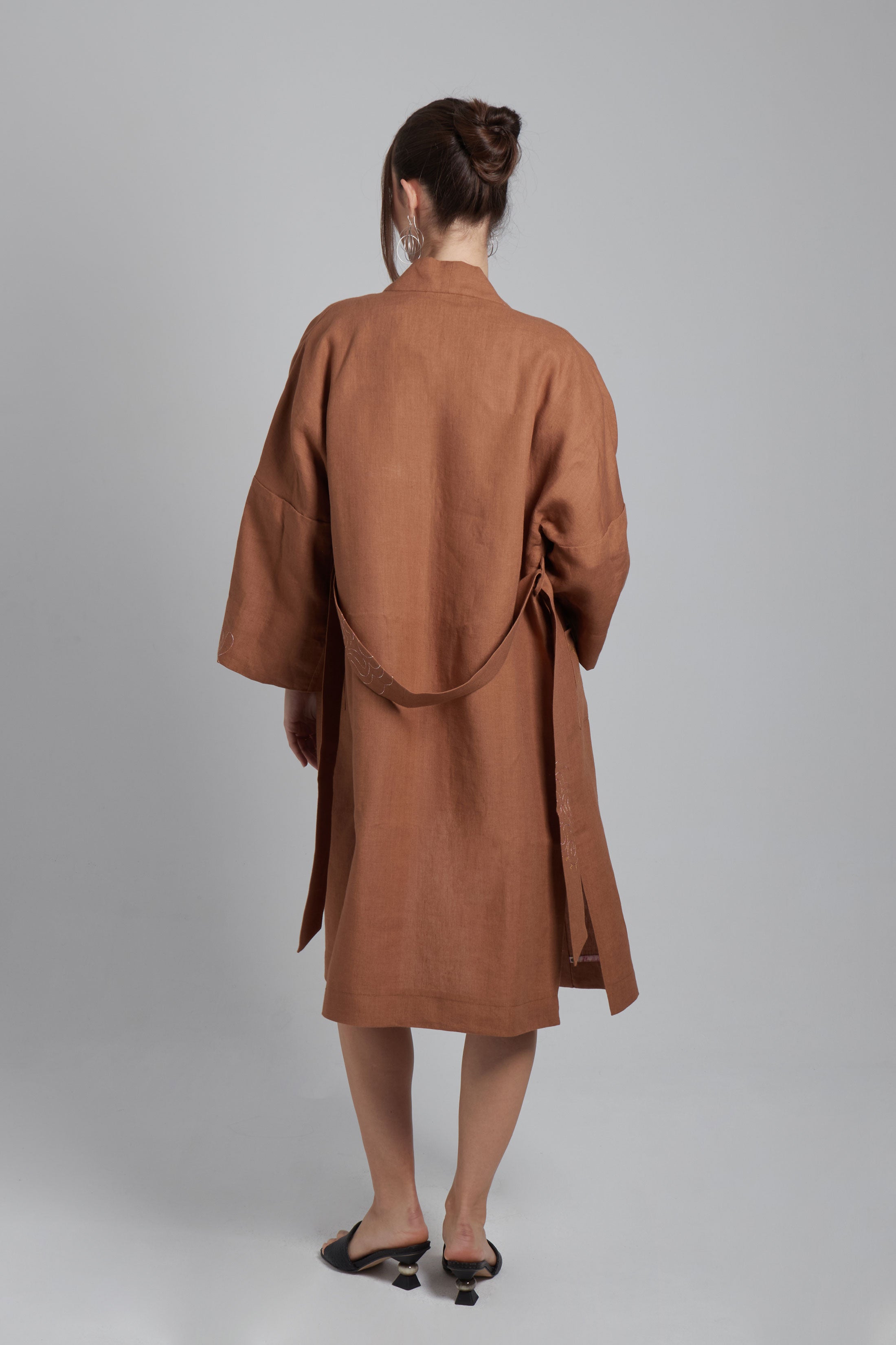 Tied-waist kimono jacket with long wide sleeves, drop shoulder and two front pockets to store your lightest treasures. In a cognac brown linen.