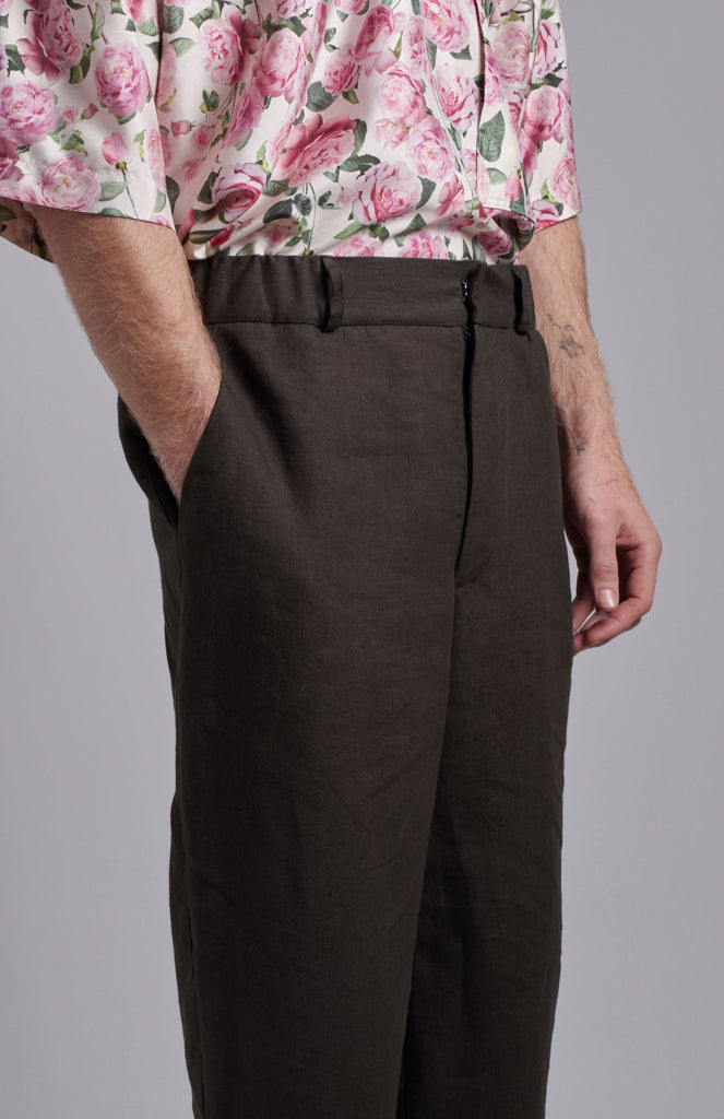 Relaxed trousers, oversized with an asymmetrical ankle line. The elastic waist comes with a discreet zipper and front hook. Two side pockets. Dark arabica linen.