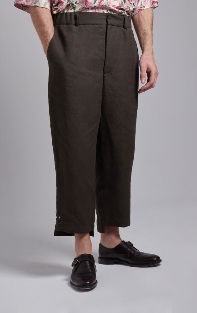 Oversized confortable linen trousers with asymmetrical details, in a dark linen