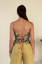 Open lace up back feminine top, ruffled hem. The print is a black background with ivory roses all over.