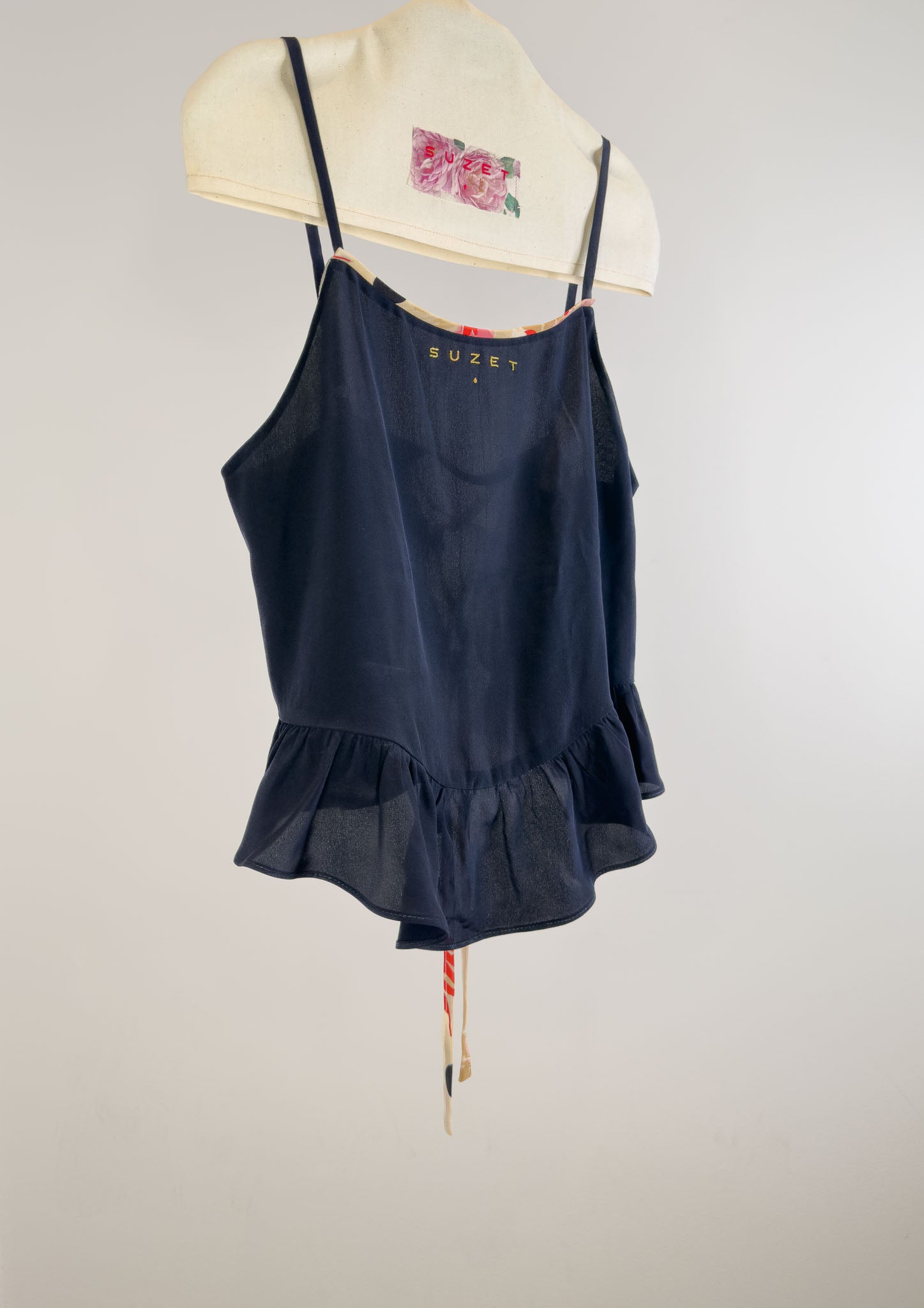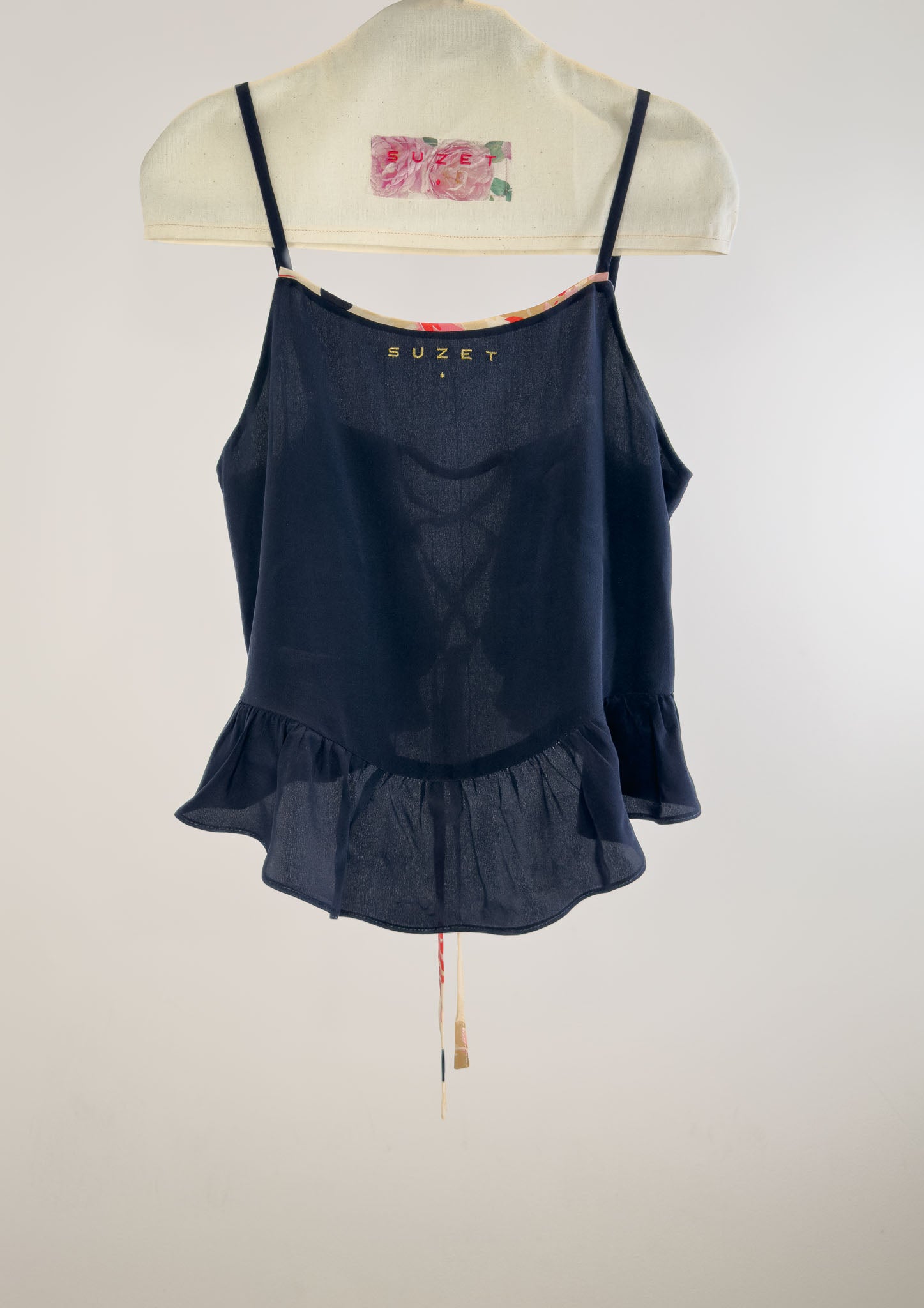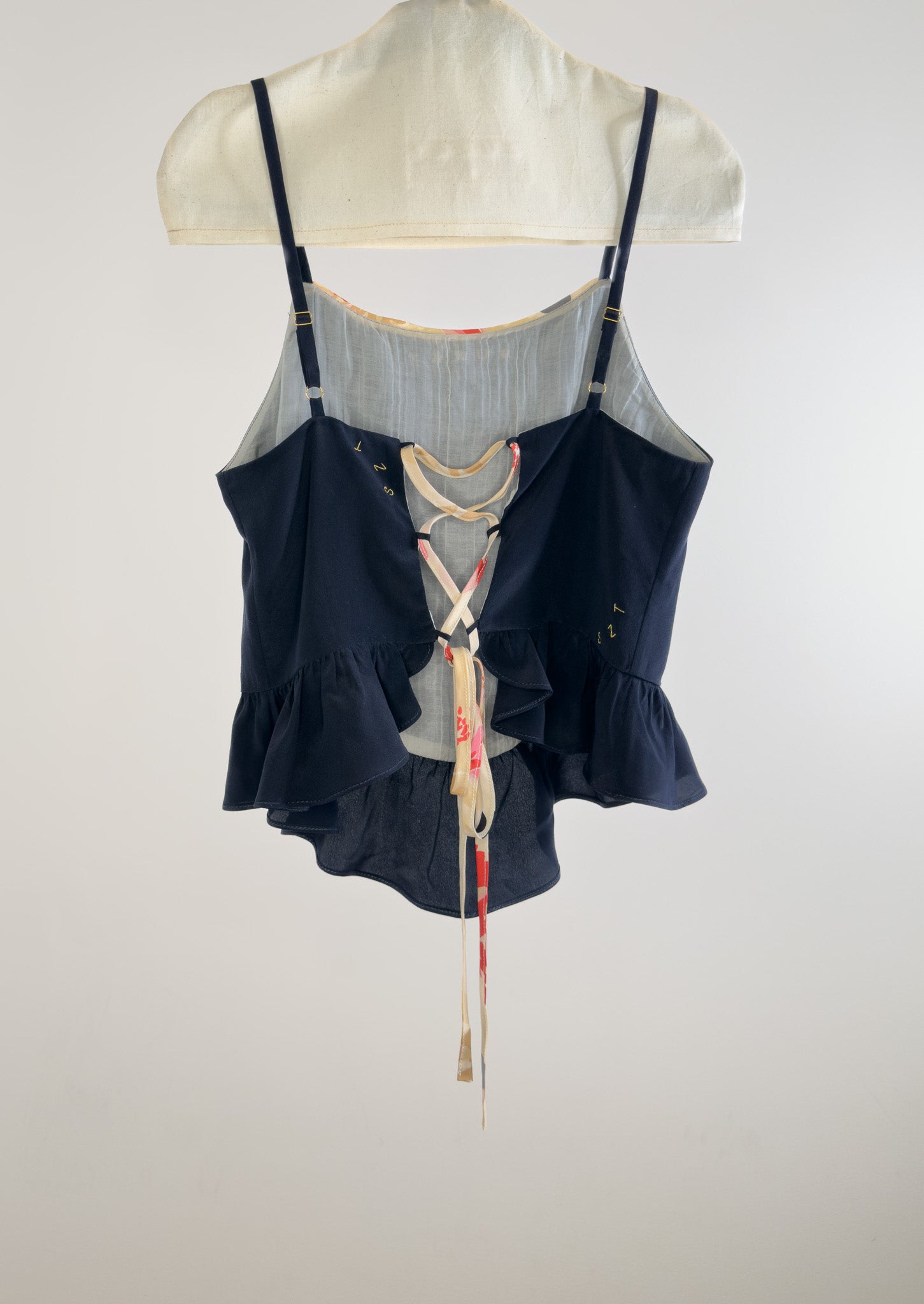 Open lace up back feminine top, ruffled hem, in a deep night blue silk crepe.