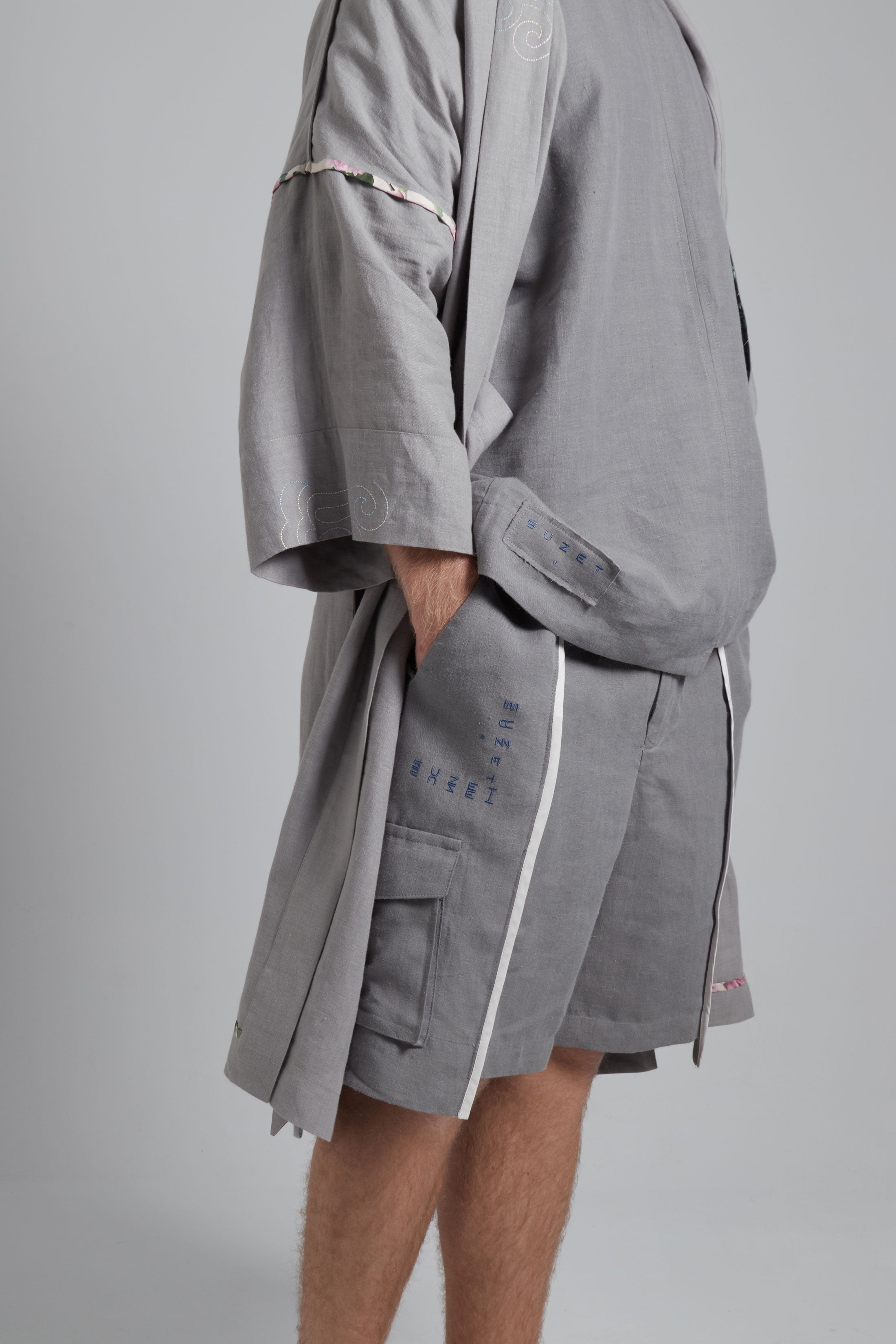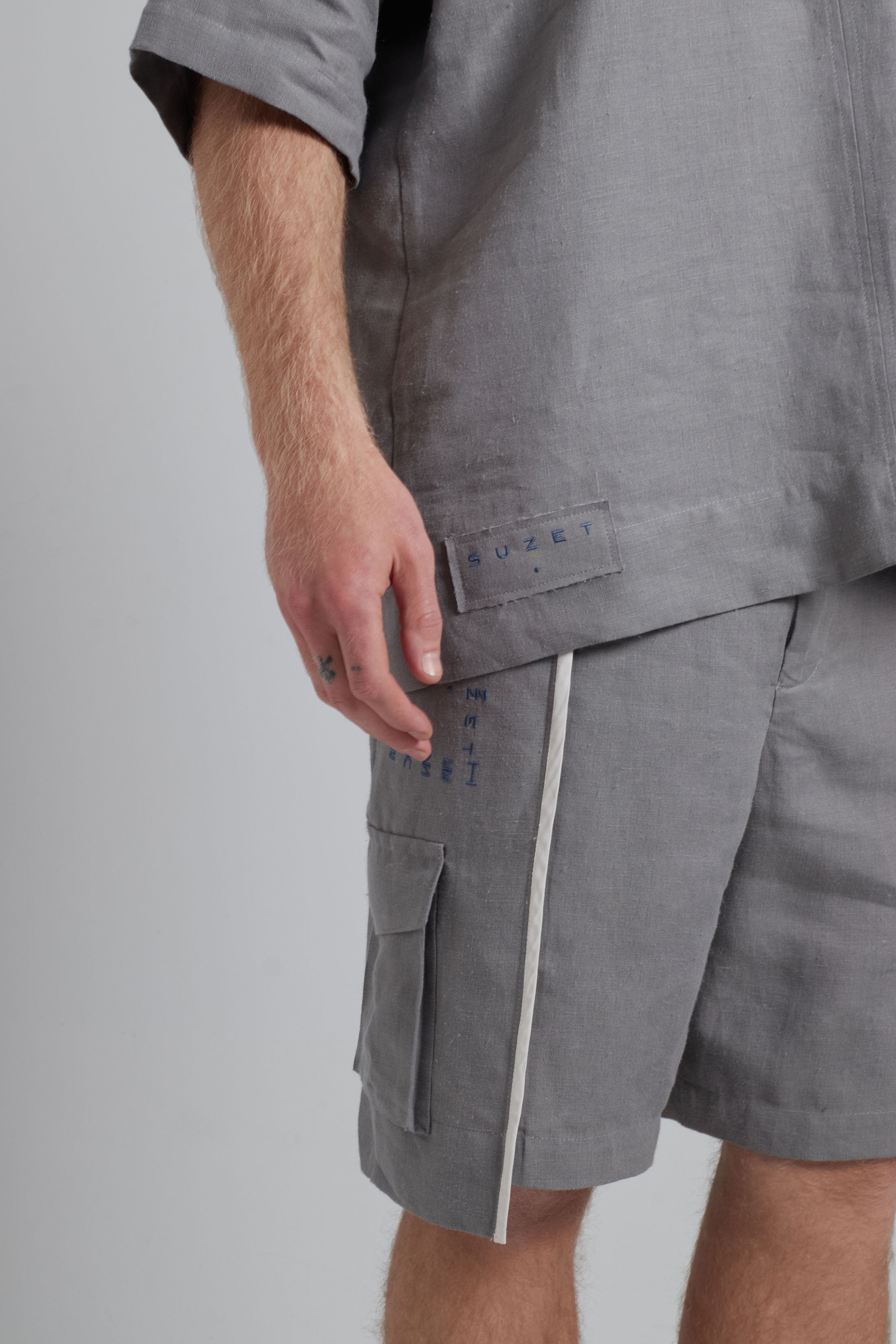 Slightly oversized asymmetrical shorts, confortable and breathable, in stone grey linen