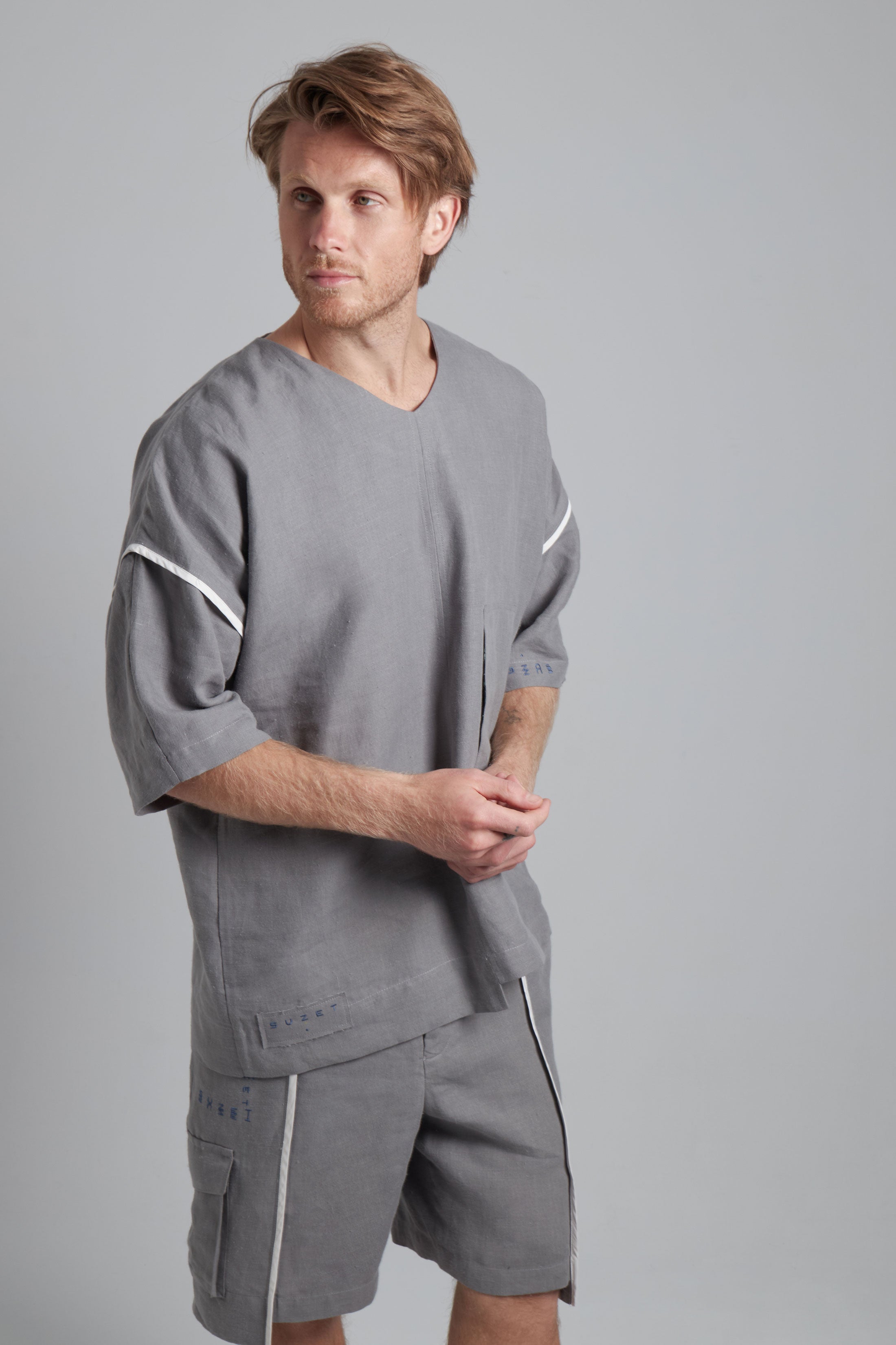 An oversized confortable tee-shirt with refined detailing, asymmetrical, in a stone grey linen