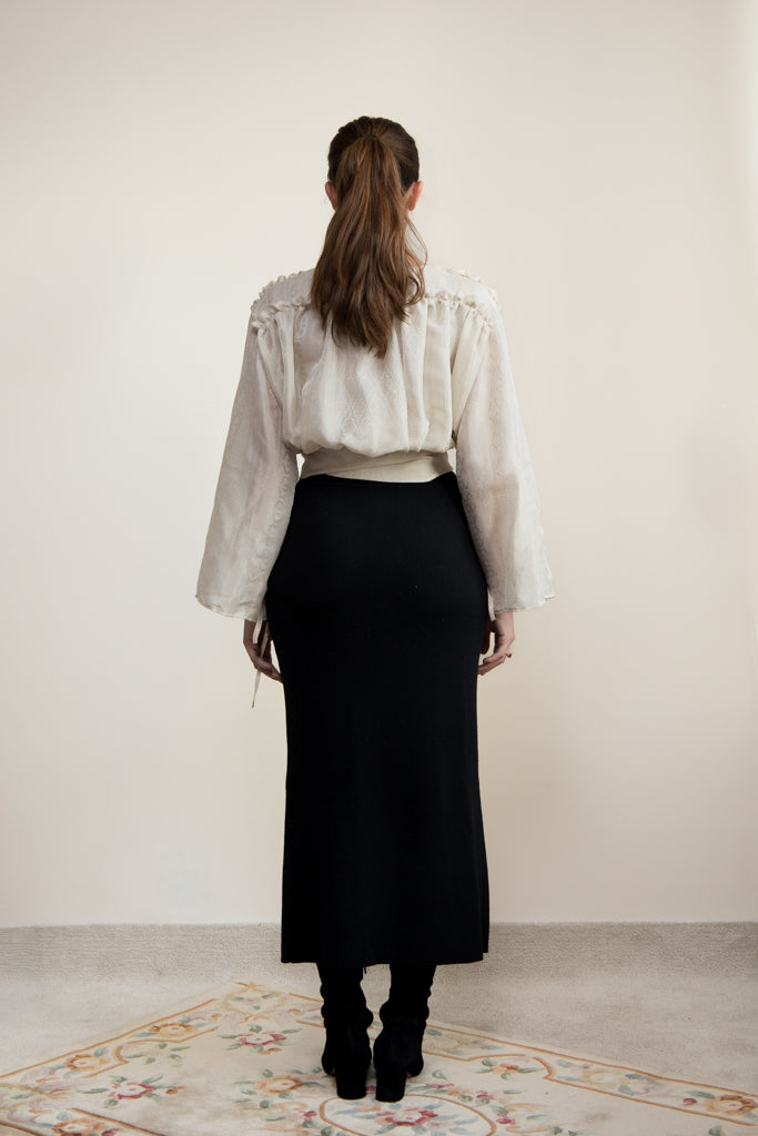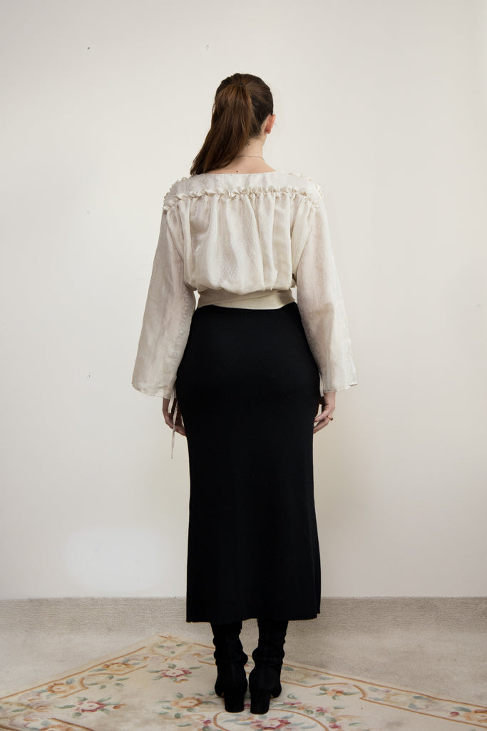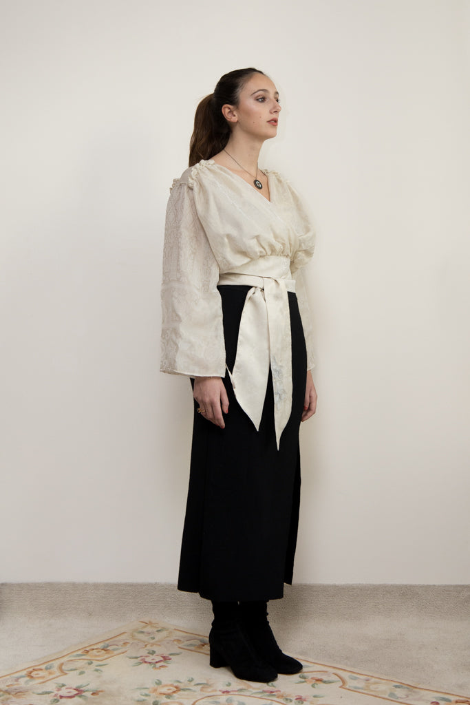 Wrap over top in a golden silk jacquard, extra long straps to tie around the waist.