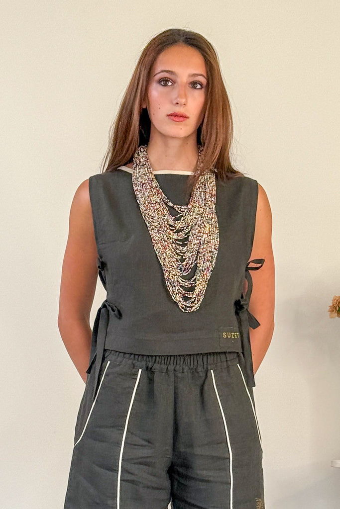 Relaxed yet tailored bib top with four ties on each side to create a total of four nods. In an arabica linen: hues of brown, grey and green. Wear it on the skin, on a tee-shirt or on a shirt.