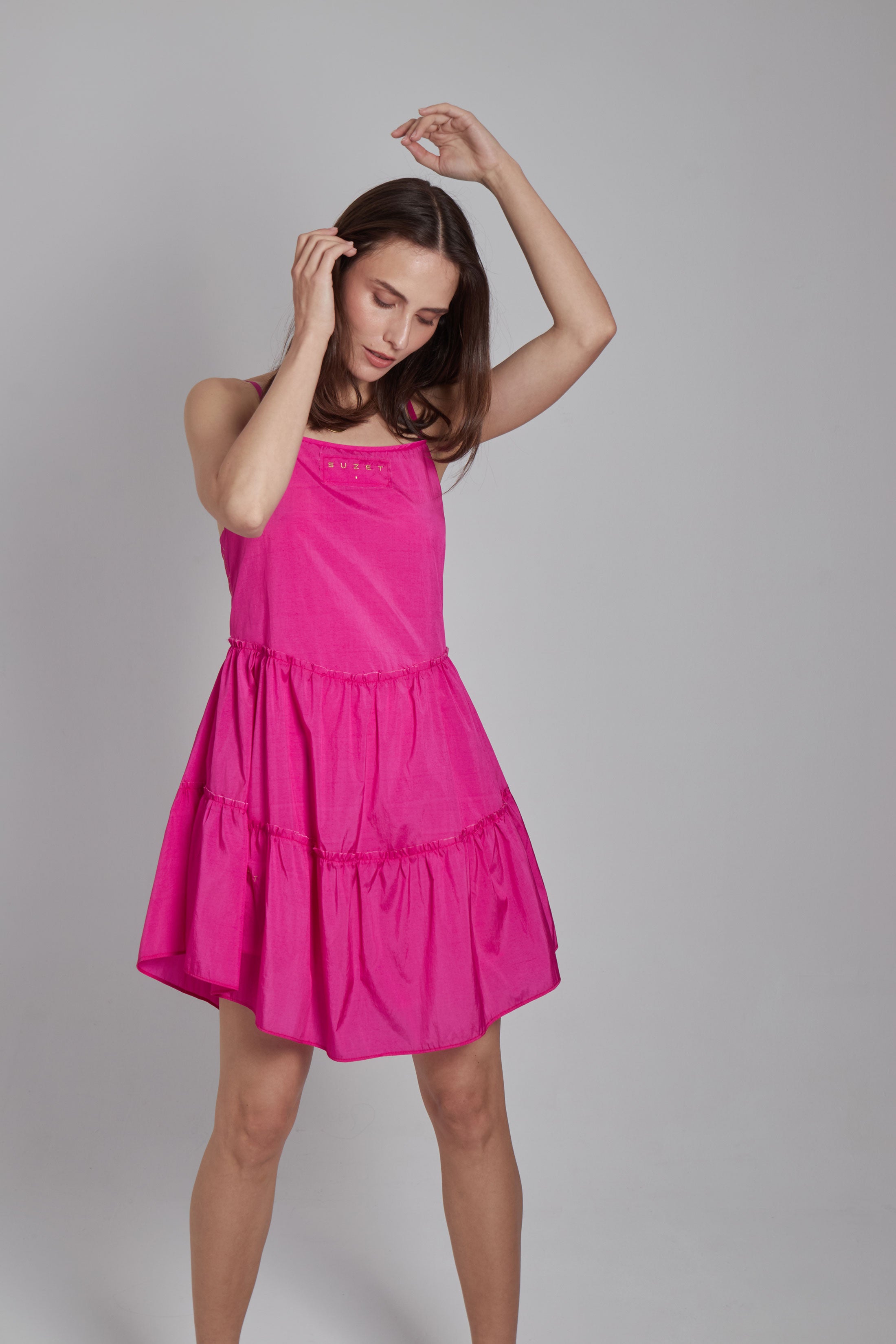 Tied back mini dress, ruffled hem, flowy volume. In a stunning fuchsia taffeta.