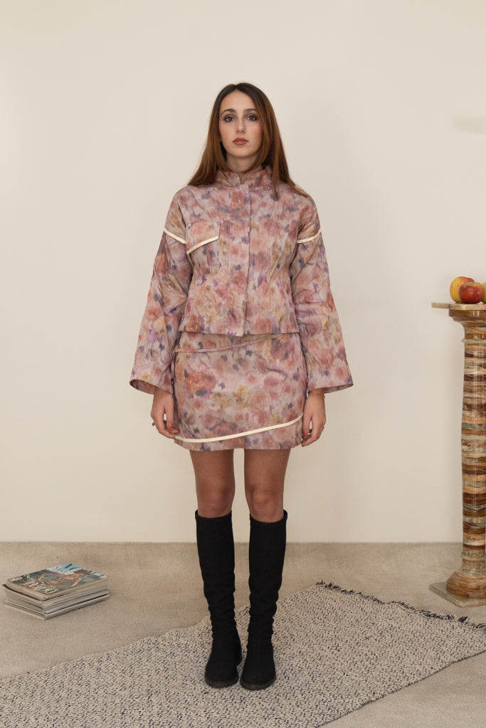 Asymmetrical mini skirt with apparent front piping, a tailored and sexy cut. Invisible zipper and a hook on the side. In a joyful printed polyamide taffeta.