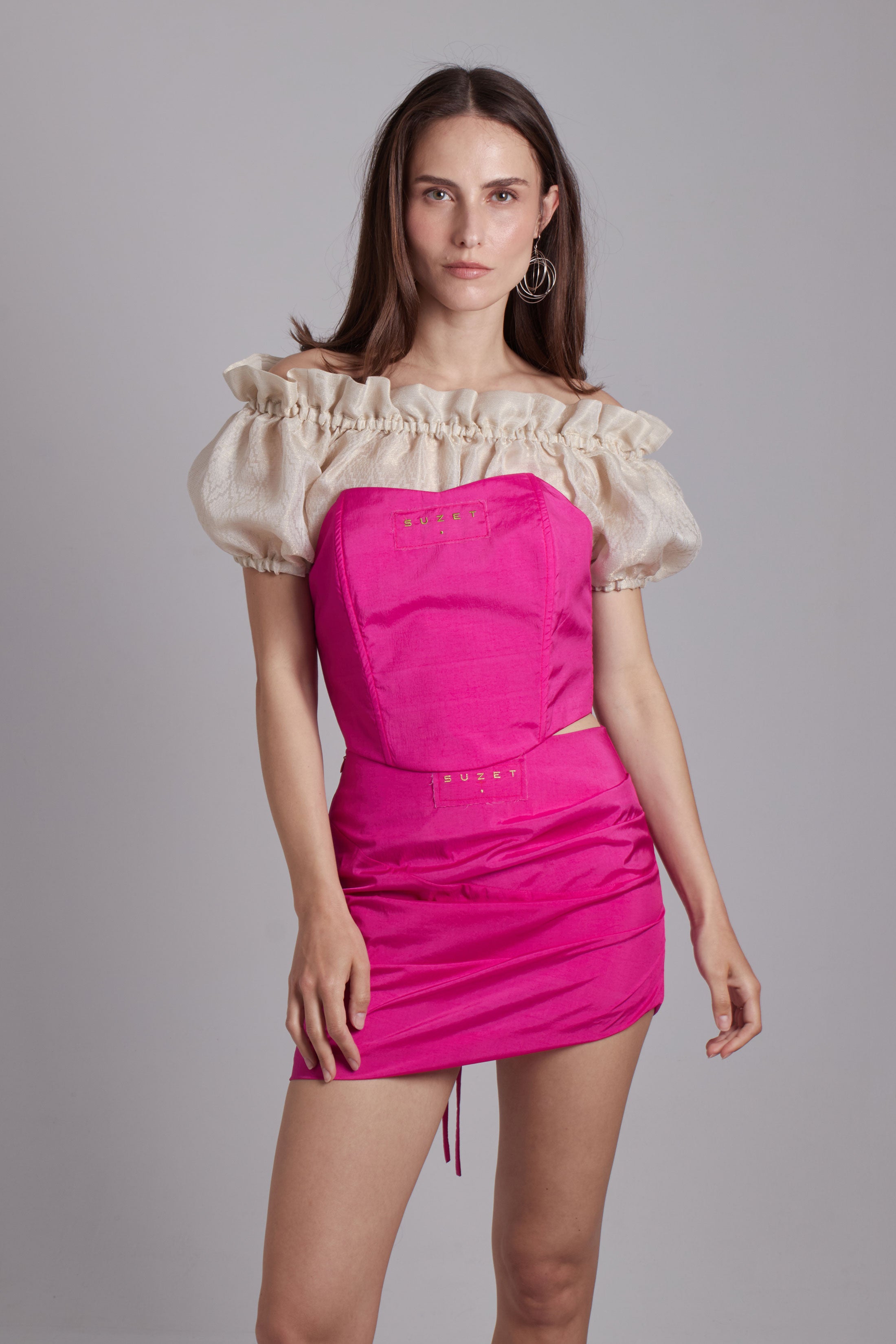 A modern corset, flexible and ultralight, easy to pack. Be playful with this second piece to wear underneath: a stunning transparent short top in pure jacquard silk, puff sleeves. When tailoring meets lightness. The back is fully open with a lace to tie up, in vibrant fuchsia with gold embroideries.
