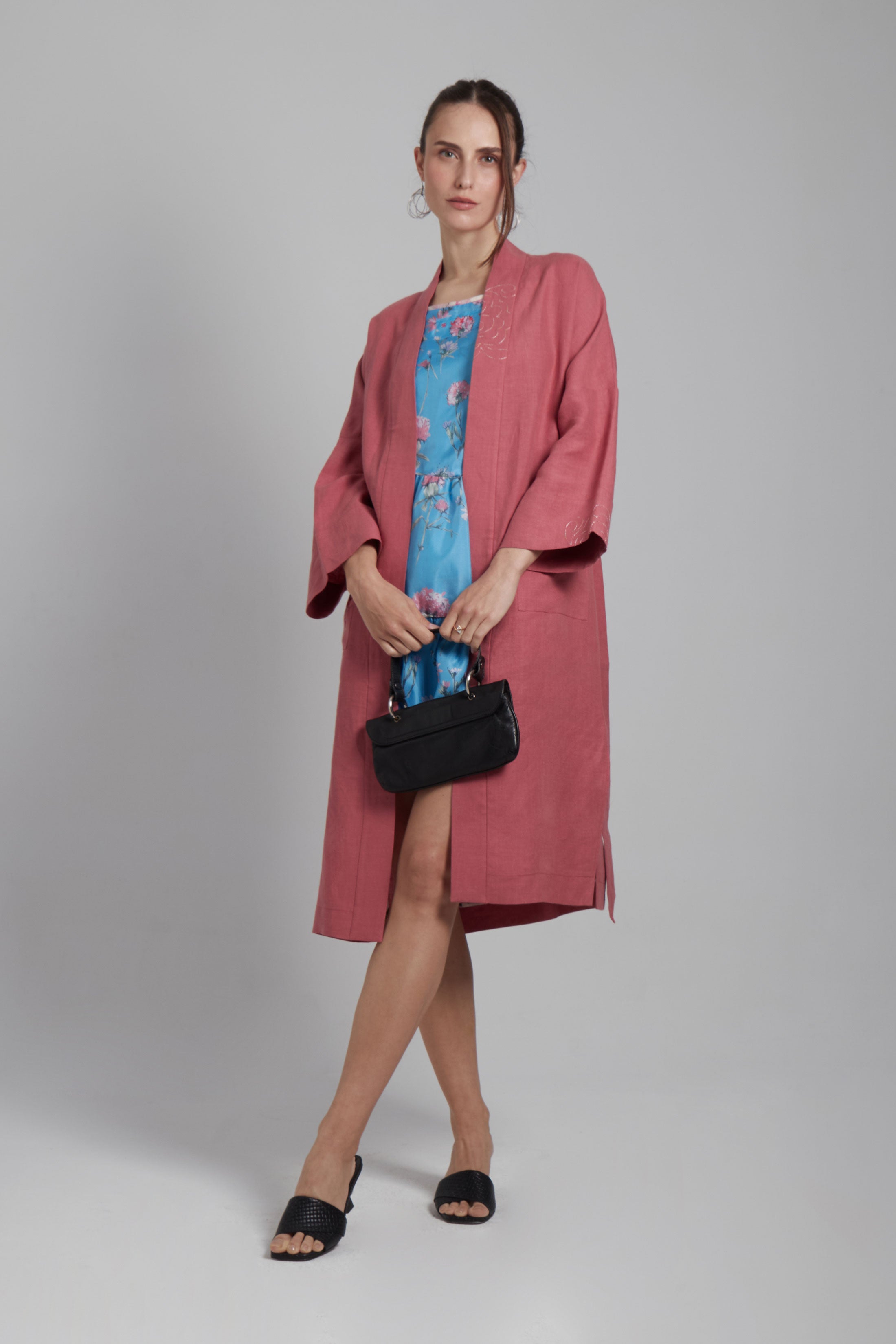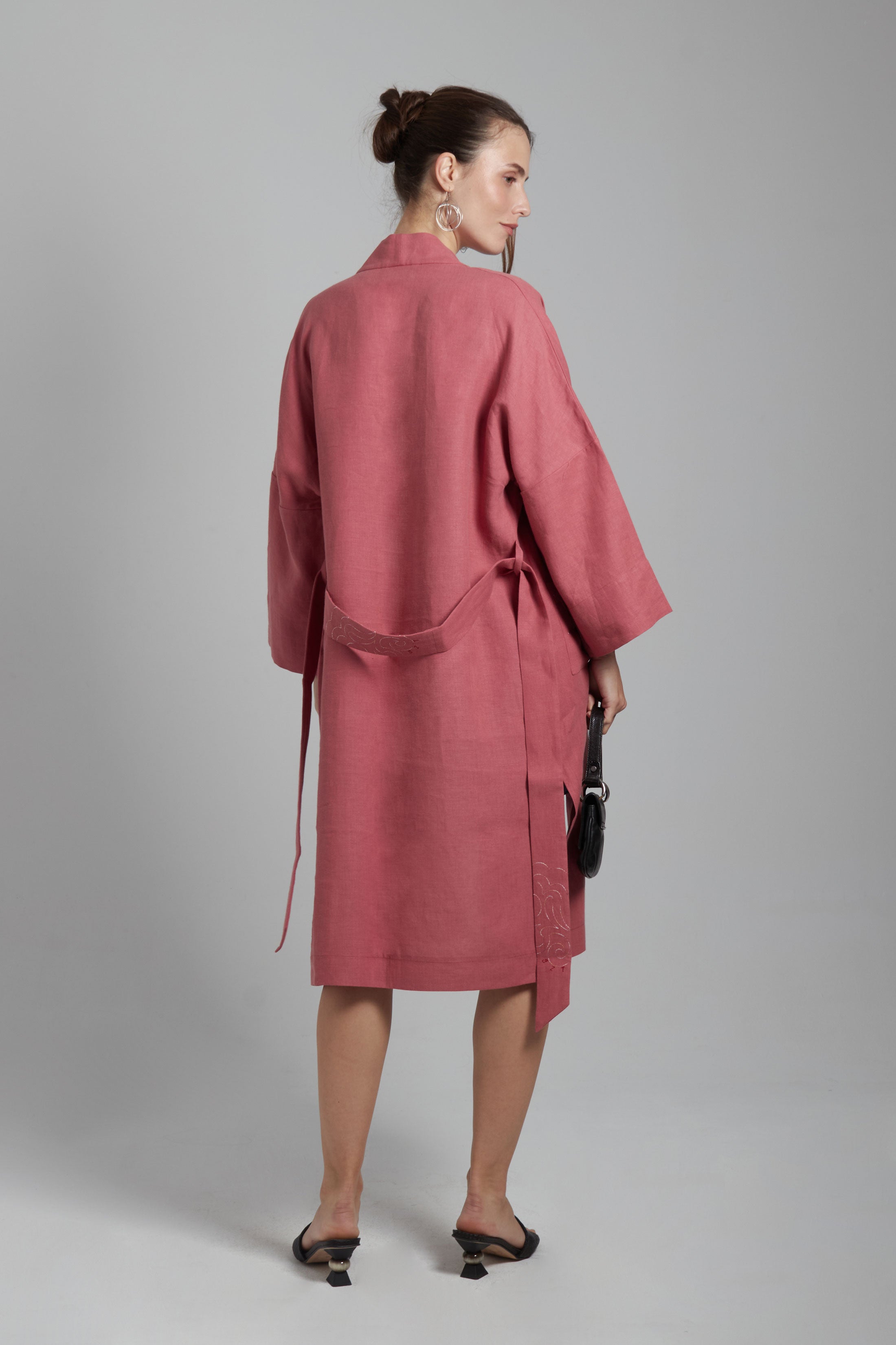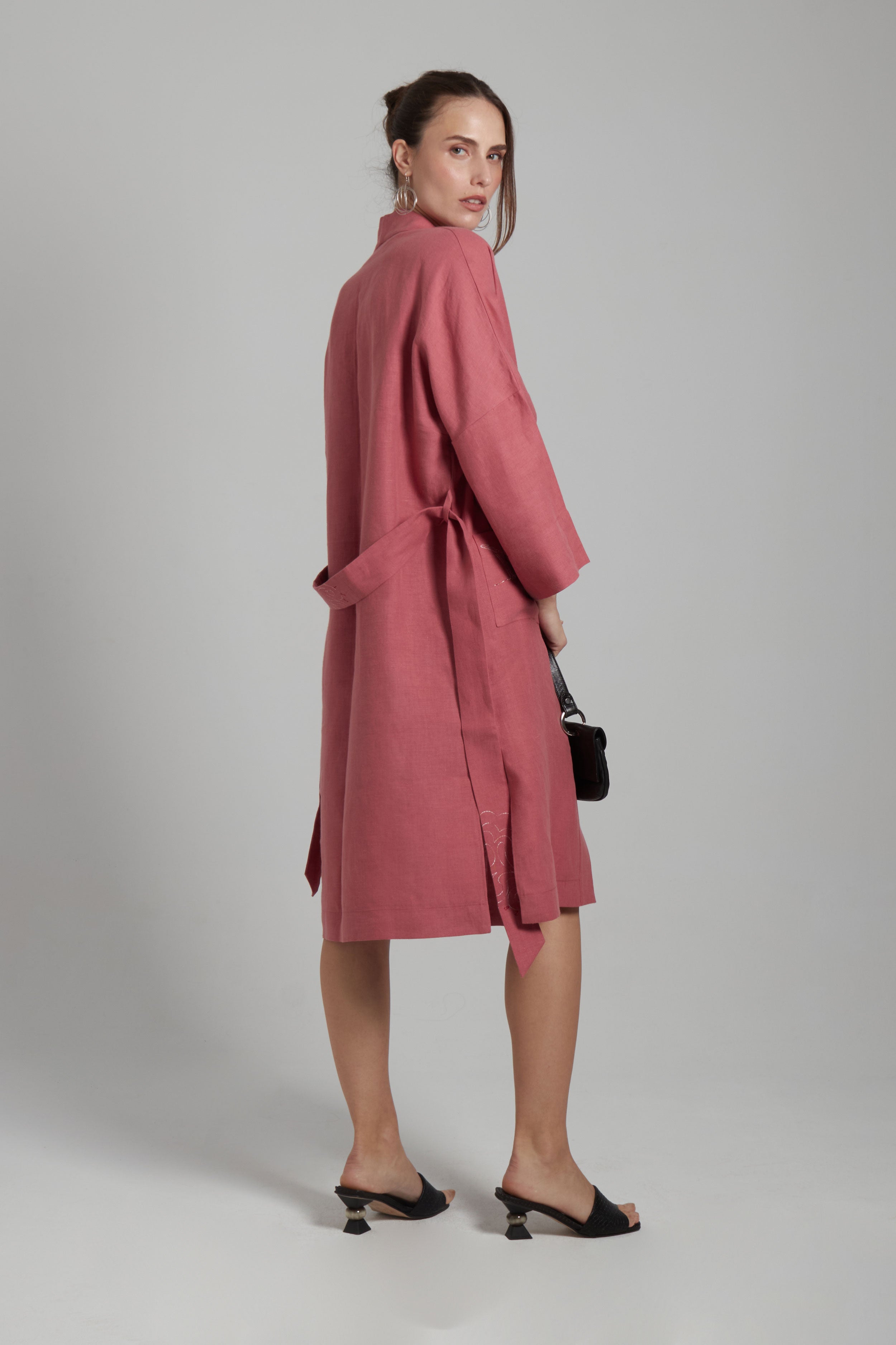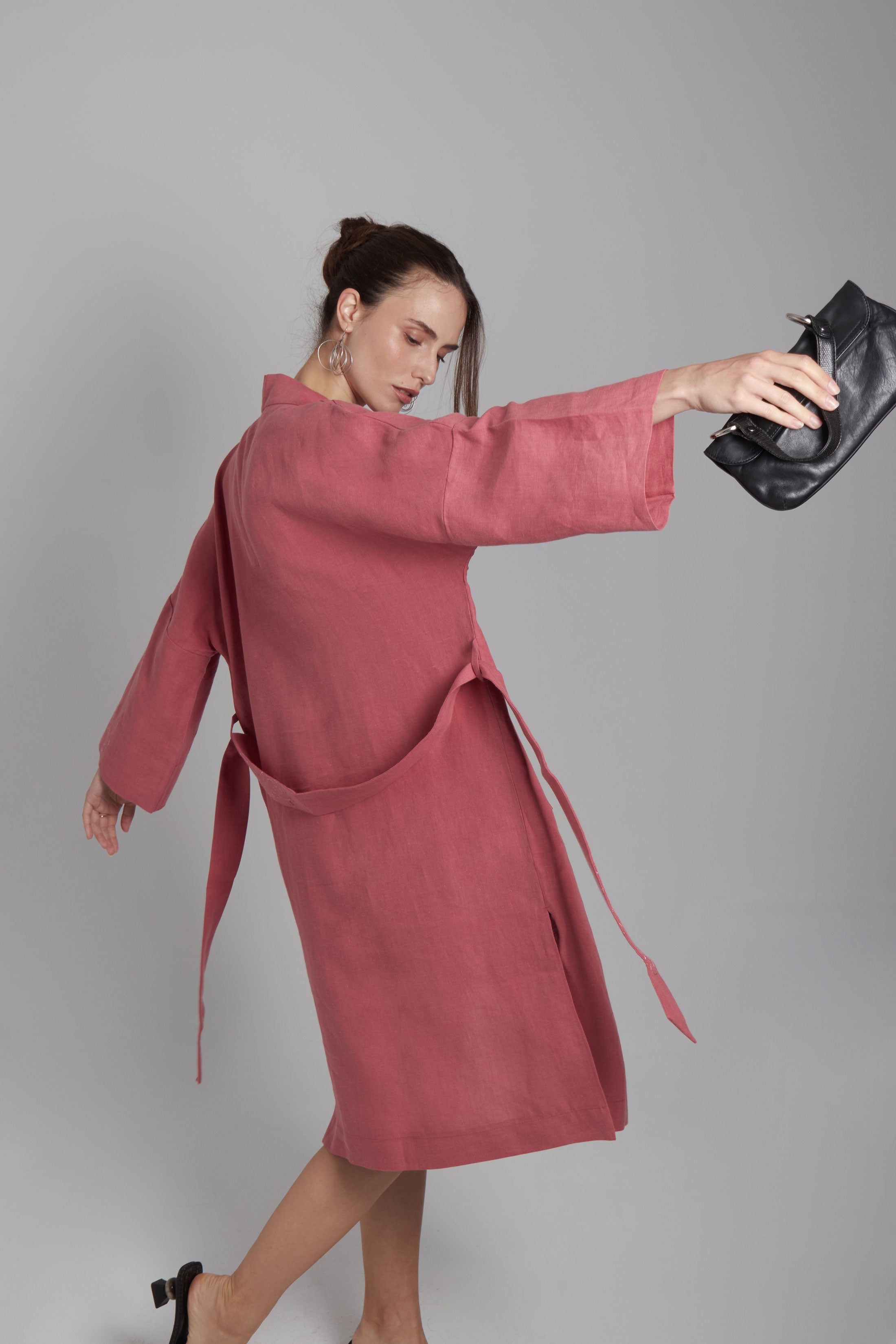 Tied-waist kimono jacket with long wide sleeves, drop shoulder and two front pockets to store your lightest treasures. In a blackberry pink linen.