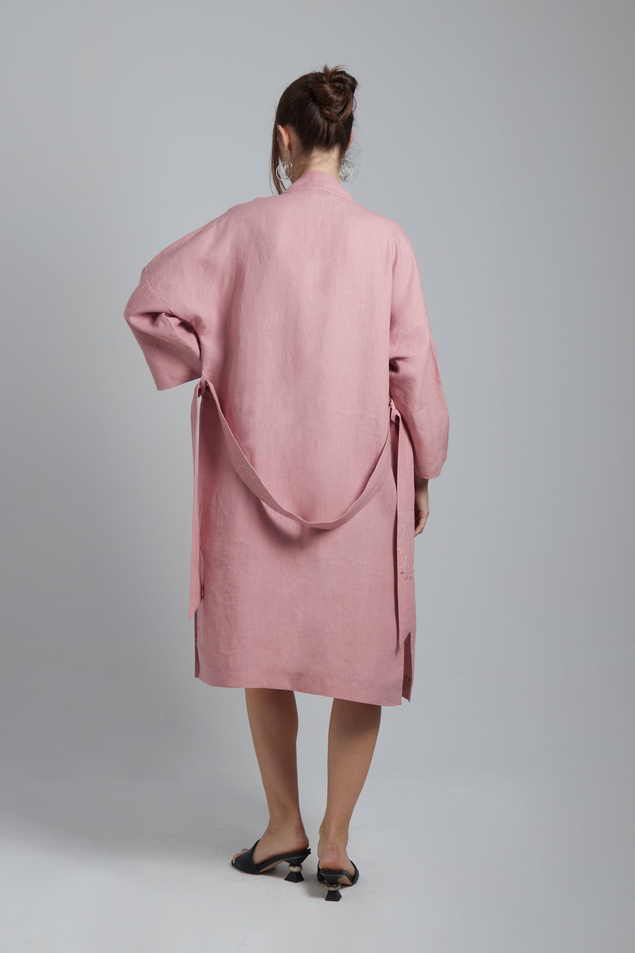 Tied-waist kimono jacket with long wide sleeves, drop shoulder and two front pockets to store your lightest treasures. In a light pink linen.