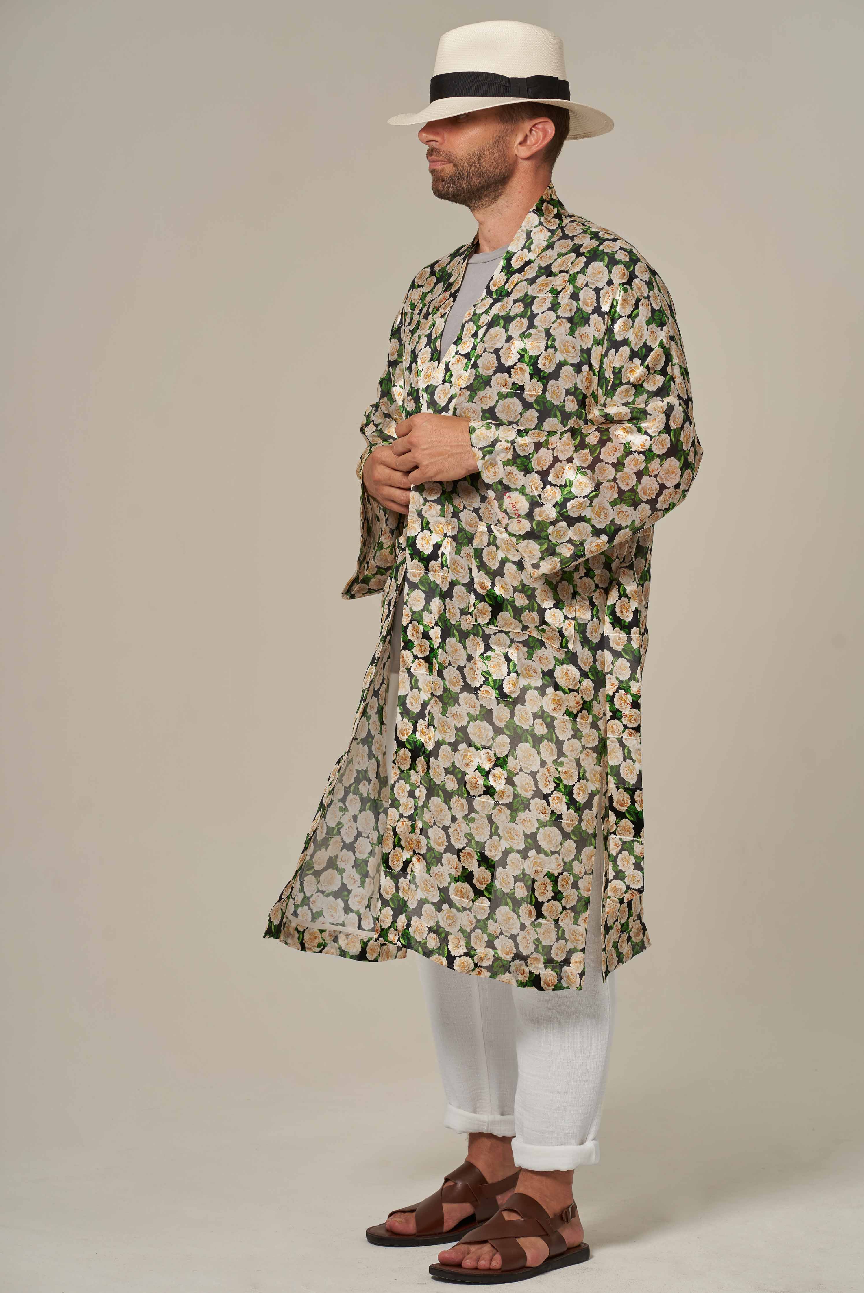 Versailles kimono for men in a floral printed silk chiffon