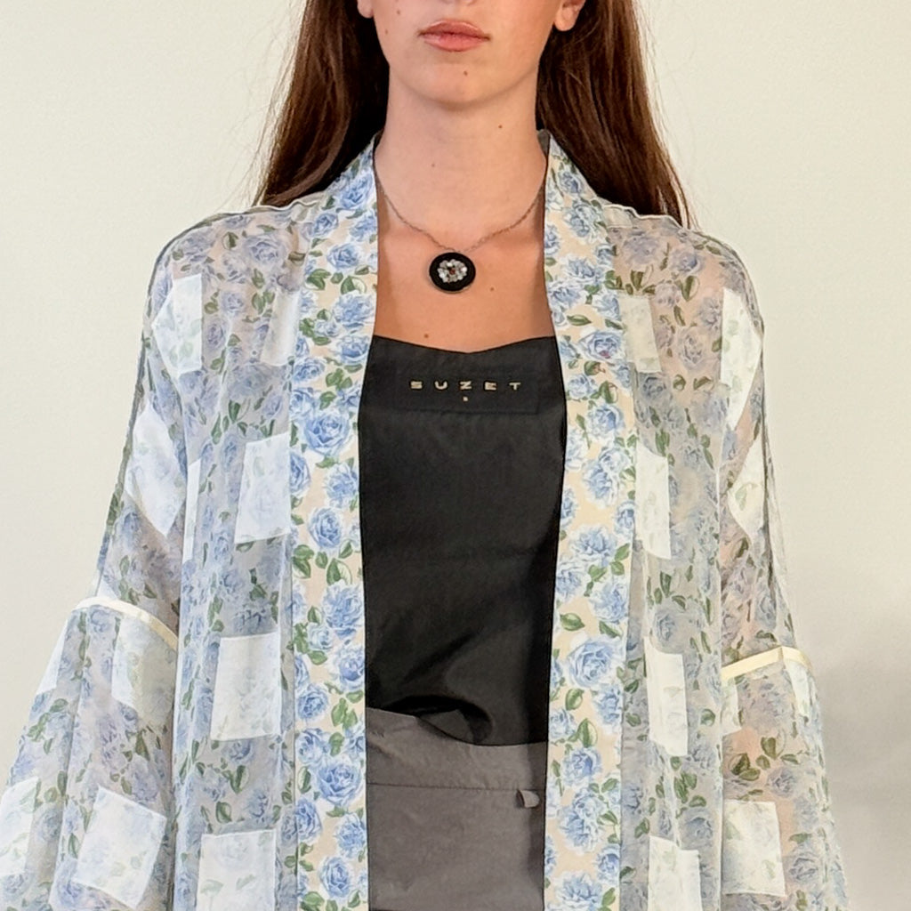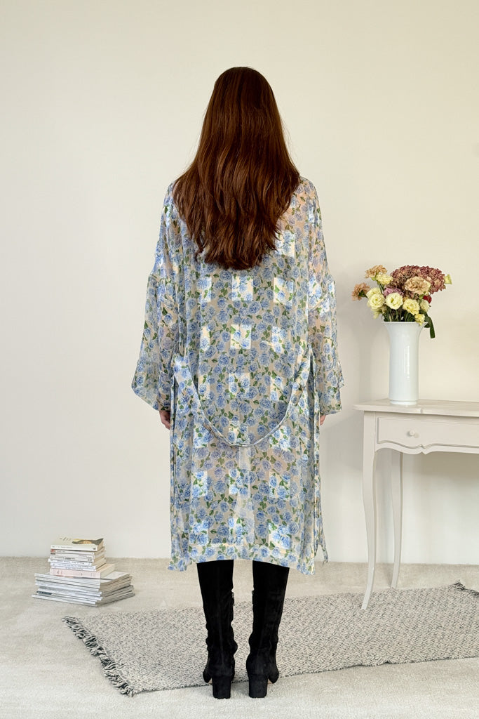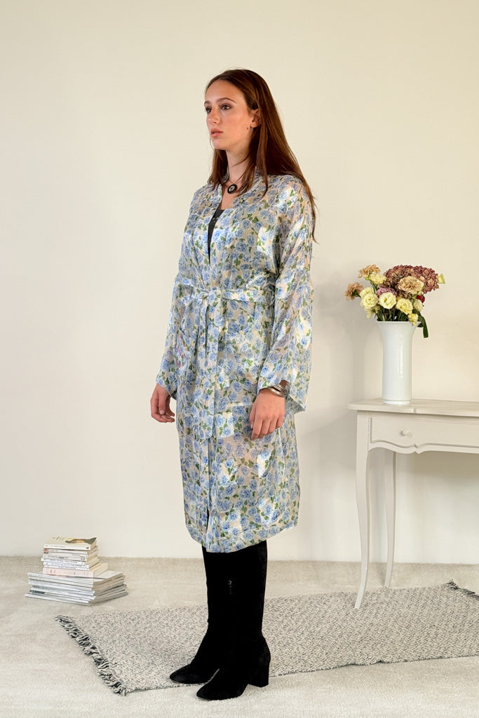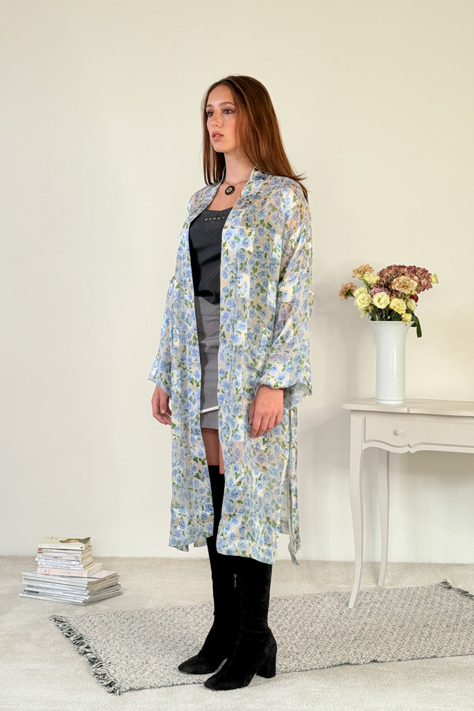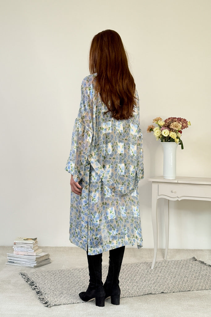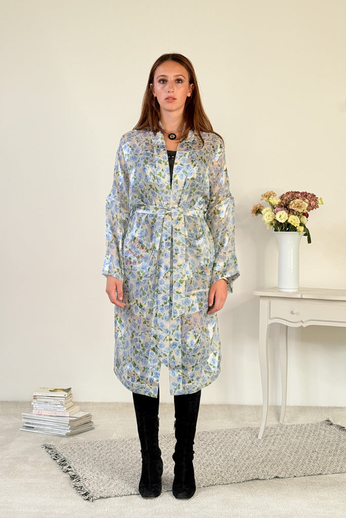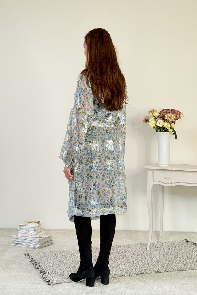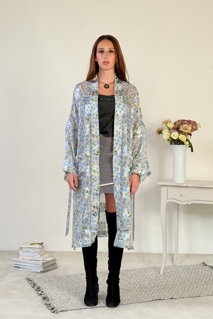 Tied-waist kimono jacket with long wide sleeves, drop shoulder and two front pockets to store your lightest treasures. In a beautifully printed silk chiffon, with blue roses.